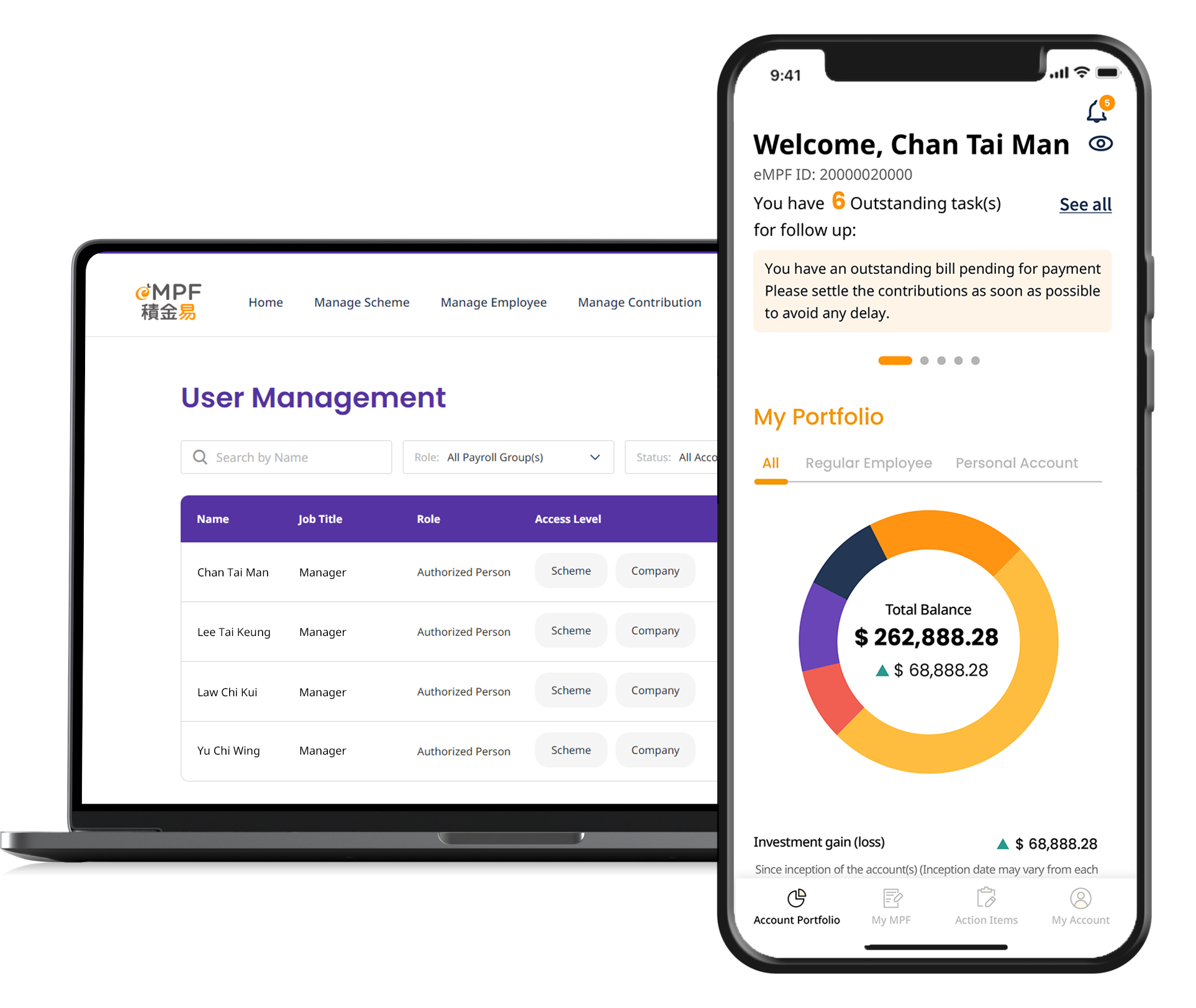 以单一平台轻松查阅及管理名下不同的强积金帐户,强积金投资组合一目了然