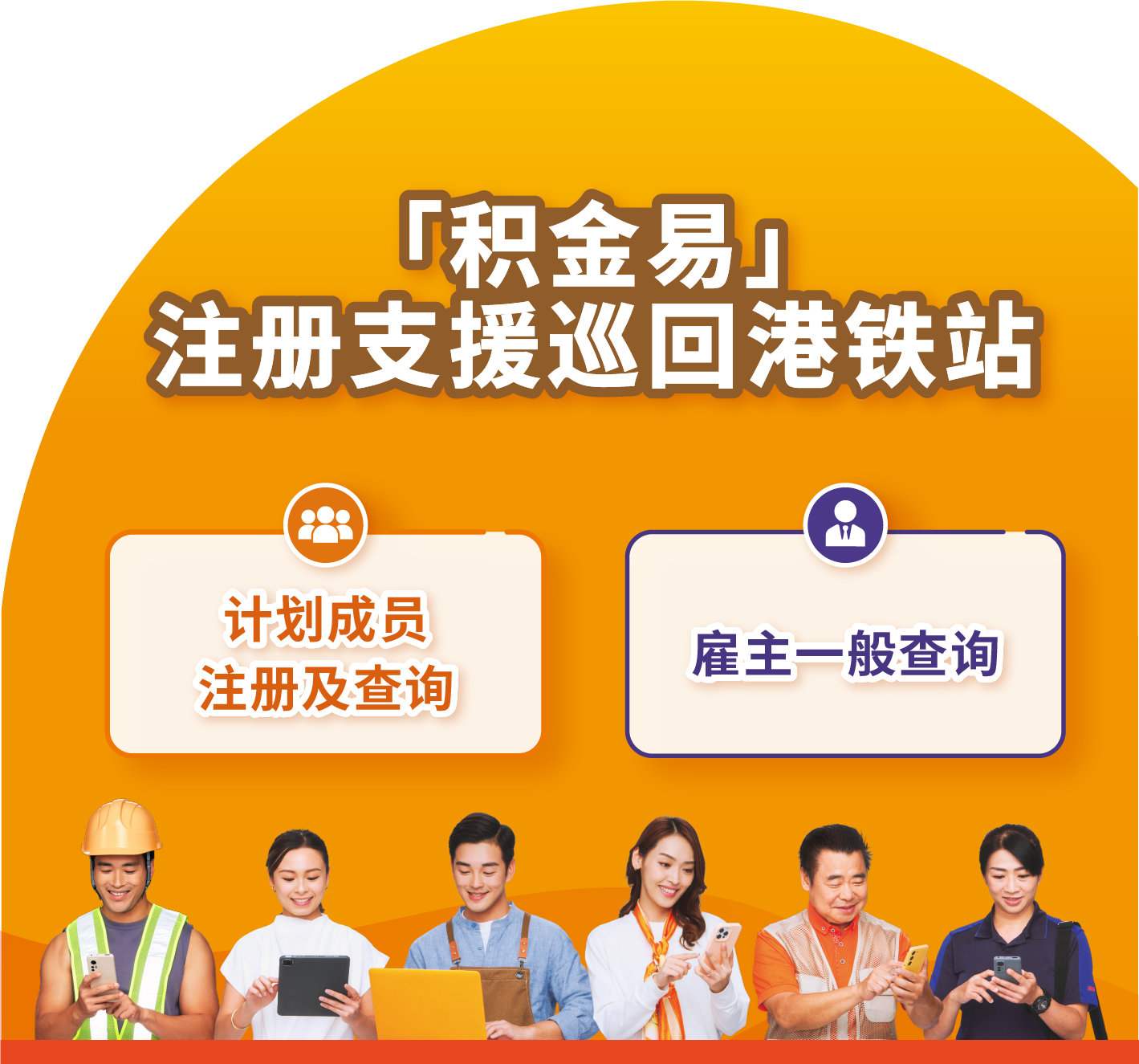 为进一步扩大地区支援服务,我们由2026年4月28日至5月29日,在5个港铁站设置「积金易」注册及查询站,为计划成员提供注册支援及查询服务。